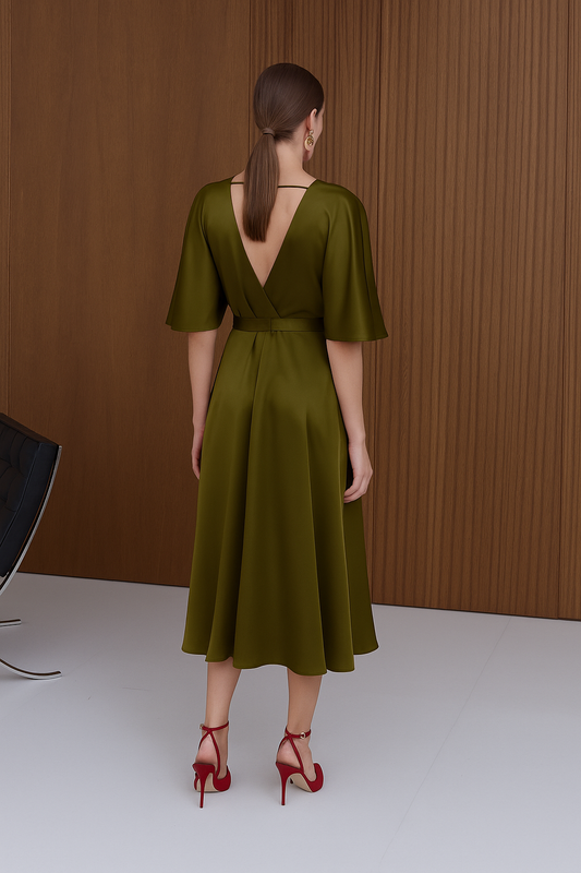 SONYA Olive Green Midi Cocktail Dress With Butterfly Sleeves