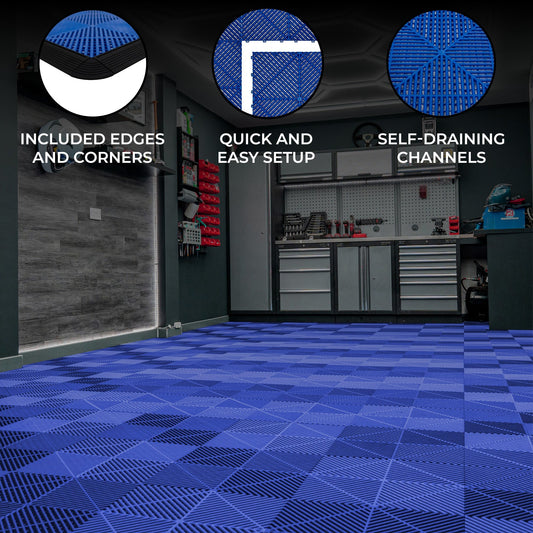 Vented Garage Floor Tiles With Edges – 60 Black & 60 Blue