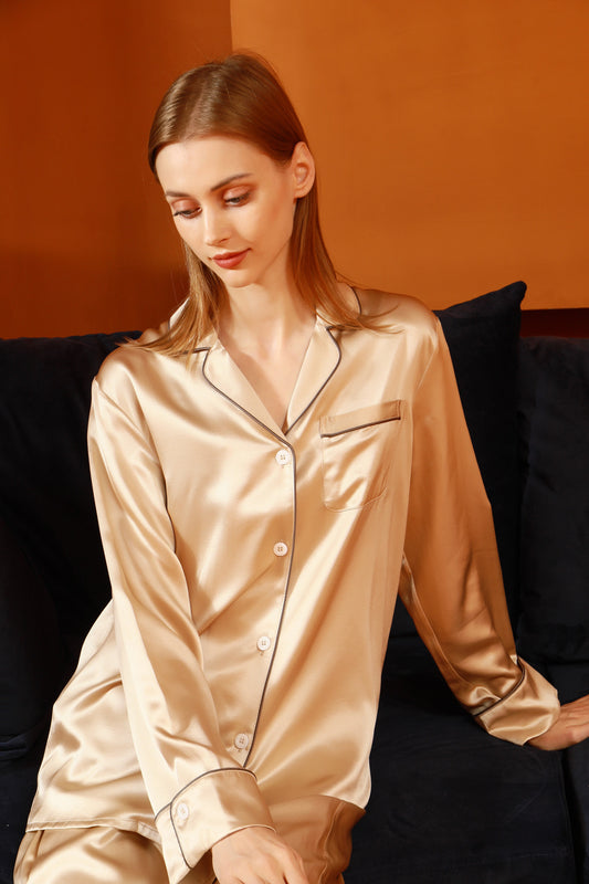 Beige Pure Silk Unisex Long Sleeve Pajama Set