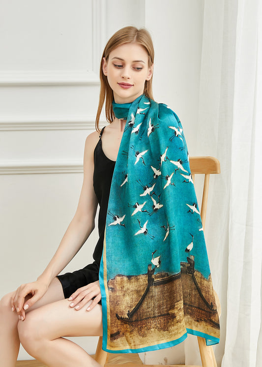 Auspicious Cranes by Zhao Ji: Mulberry Silk Long Scarf / Small Square Scarf / Ink and Colour Painting
