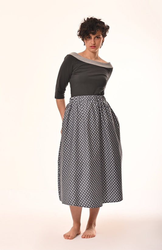Boho Midi Skirt With Pockets In Grey Polka Dot