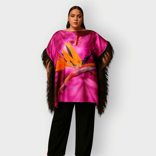 Bird of Paradise Pink Purple Silk Black Feather Top- Made To Order