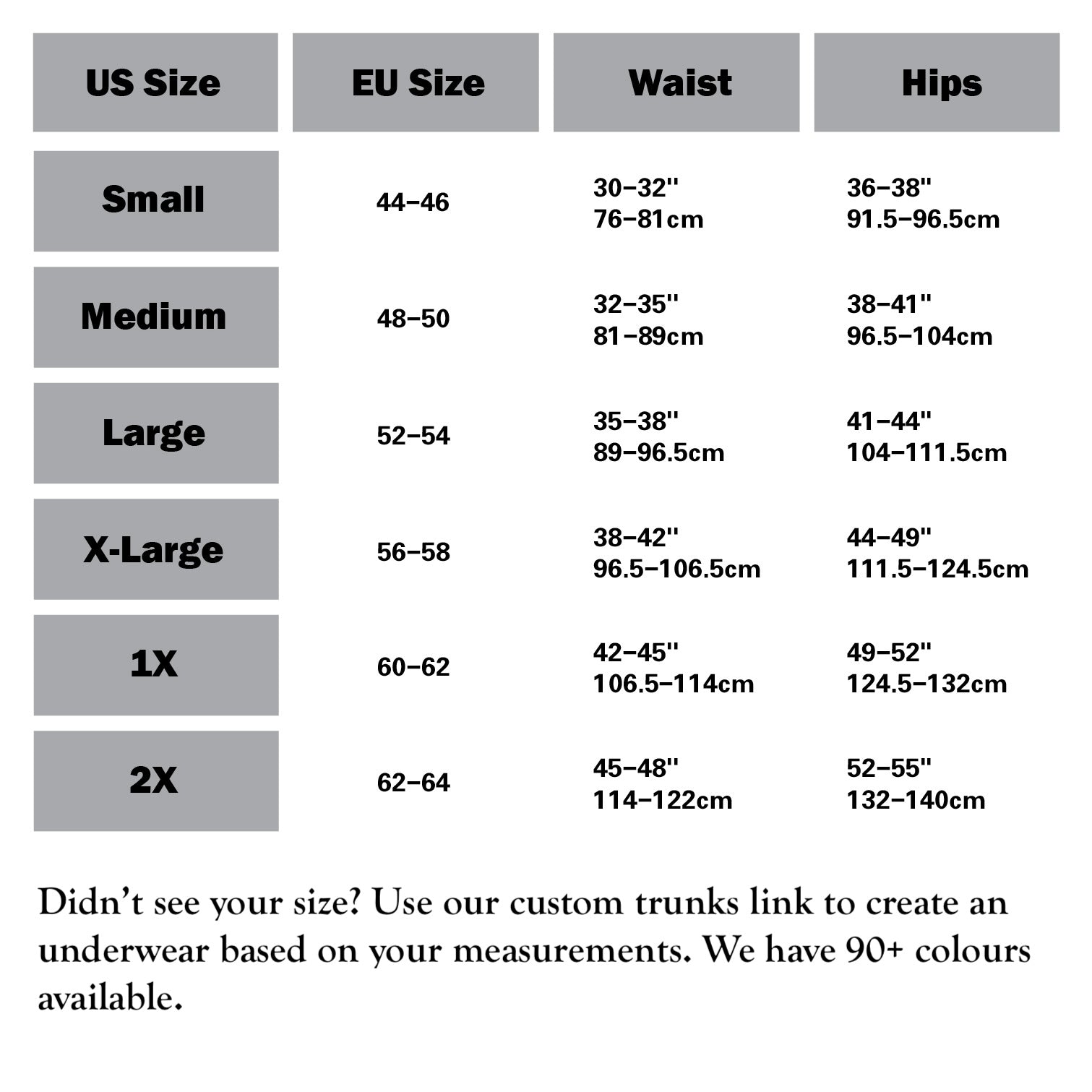 - Choose your size based on our size chart, or choose Custom Size and provide your height, waist and hips measurements in the Notes section in your shopping cart before checking out