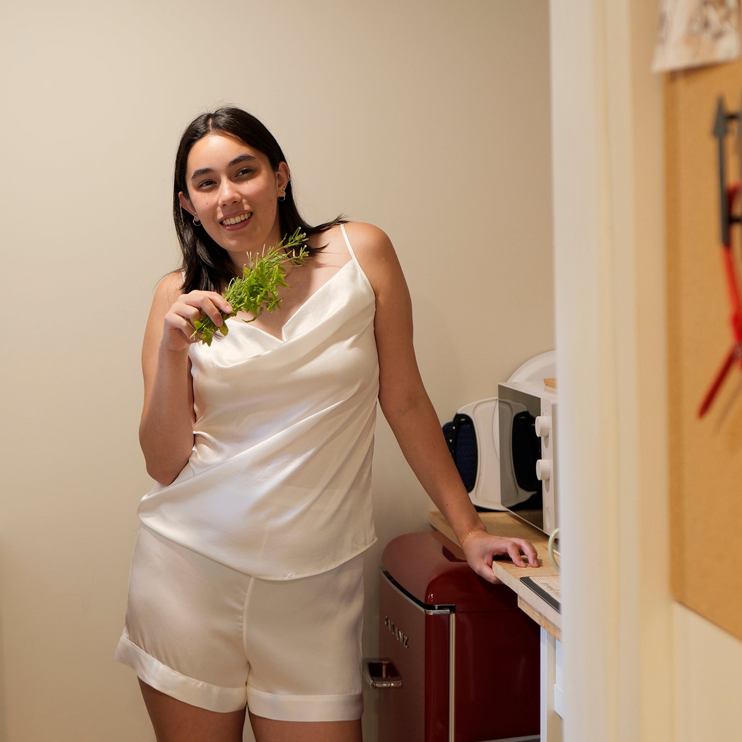 A draped cowl neckline camisole top and a high waist shorts made from pure mulberry silk so soft you'll never want to take them off. Worn separately or together, the set makes for an effortlessly chic wardrobe.