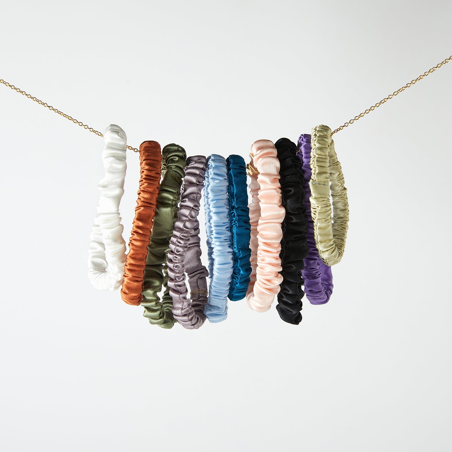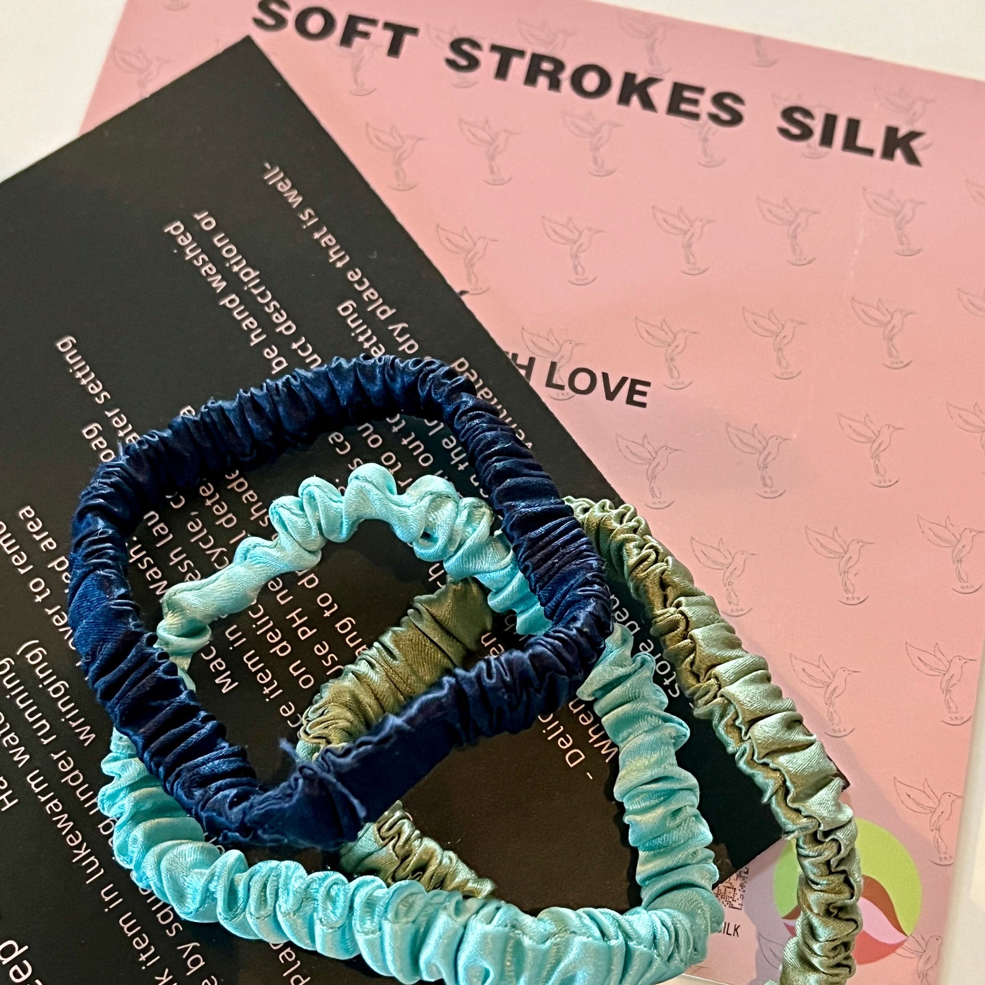 We often take custom lingerie orders. As a result, our tailor often got leftover silk fabric that is too small for anything except for scrunchies.