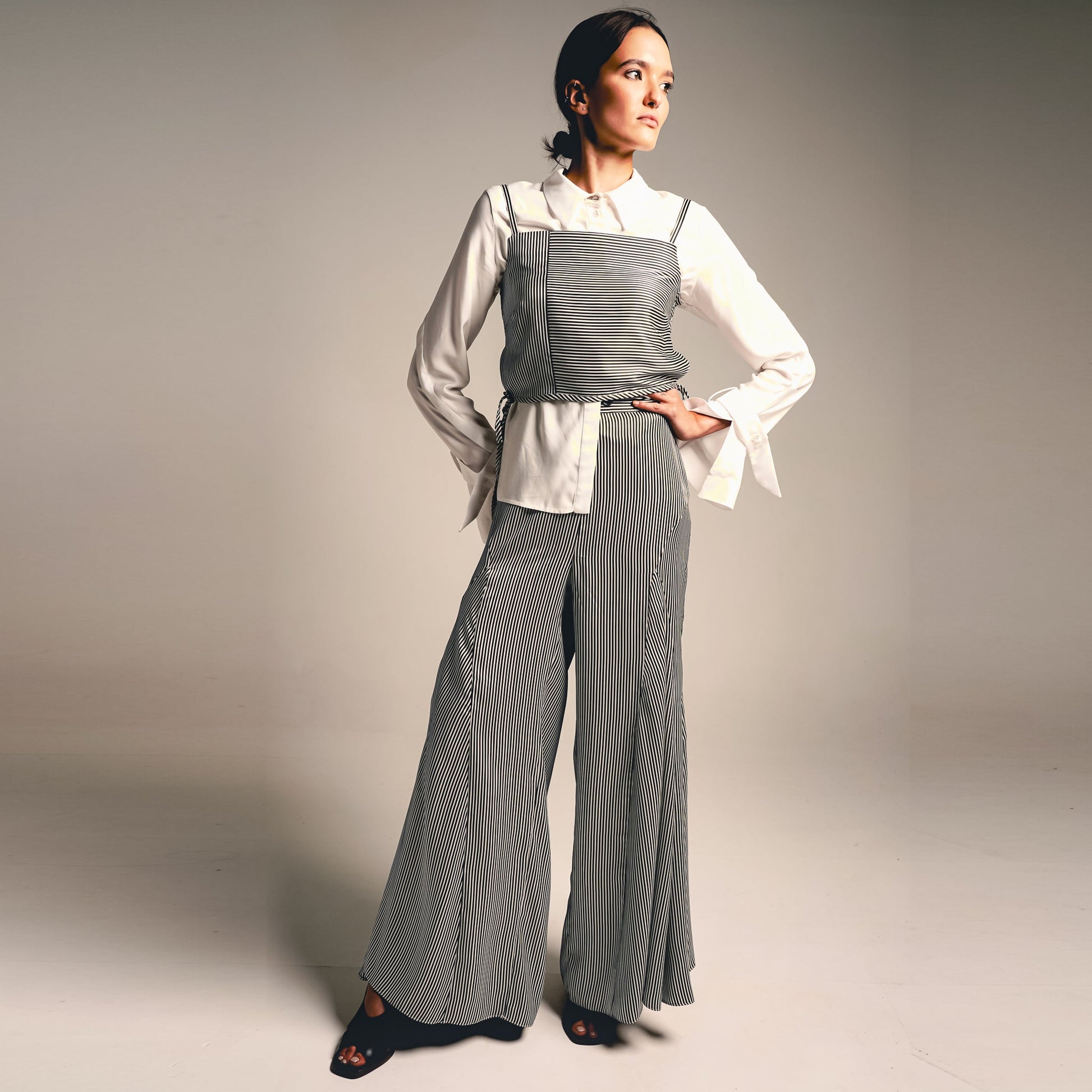 A bold, waist-length crop top with side ties and contrast panels — made from luxurious rescued fabric with a soft, silk-like drape. Designed to layer or stand alone.