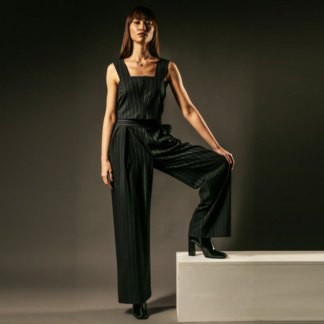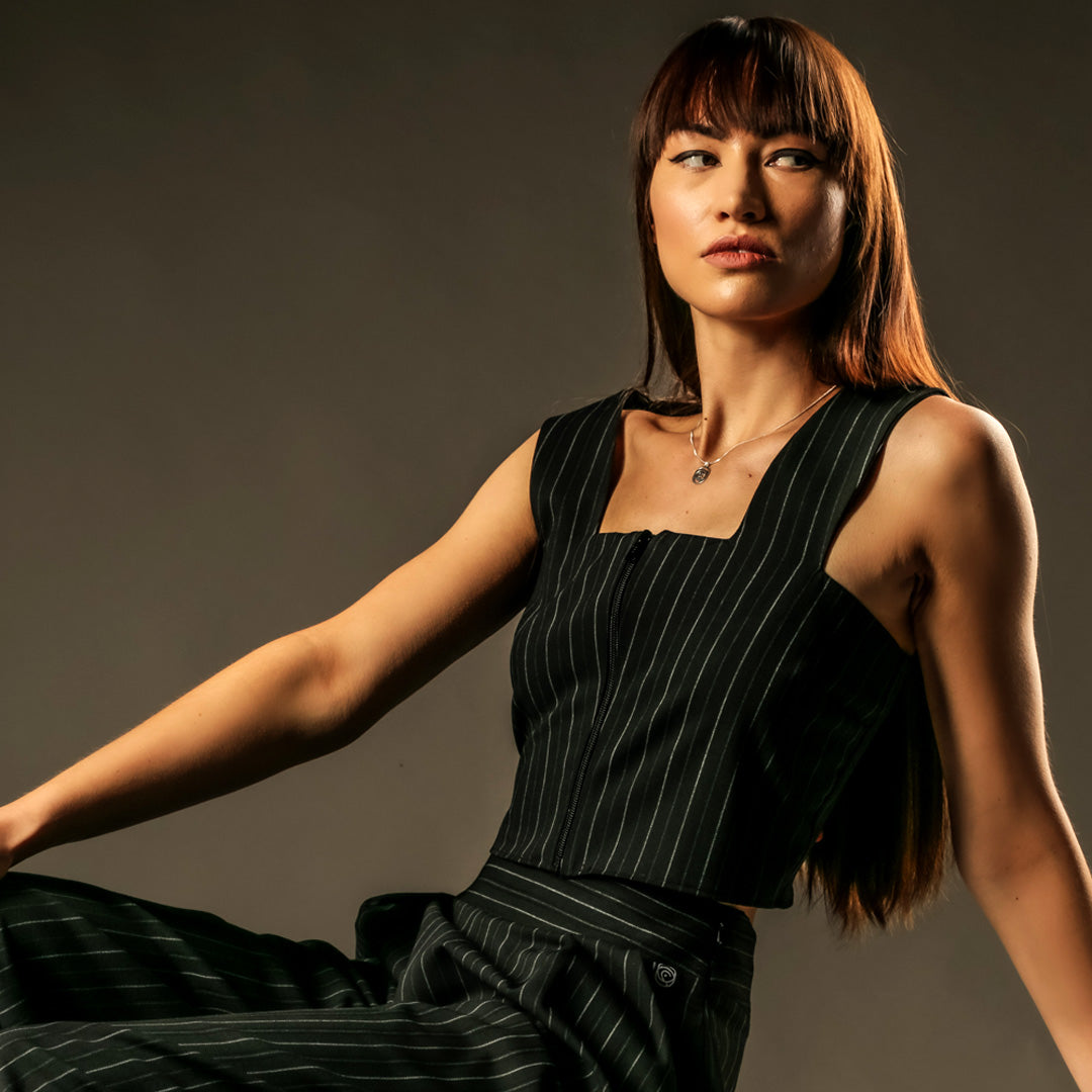 Our Suited Crop Top offers a fresh take on feminine tailoring. Crafted from high-quality suiting fabric, it features a fitted silhouette with a front zip opening and a waistcoat-inspired ring detail at the back. Versatile and ideal for layering, this piece brings modern structure to any outfit.