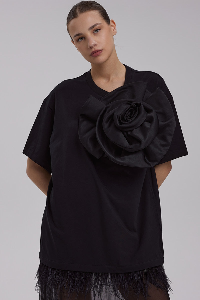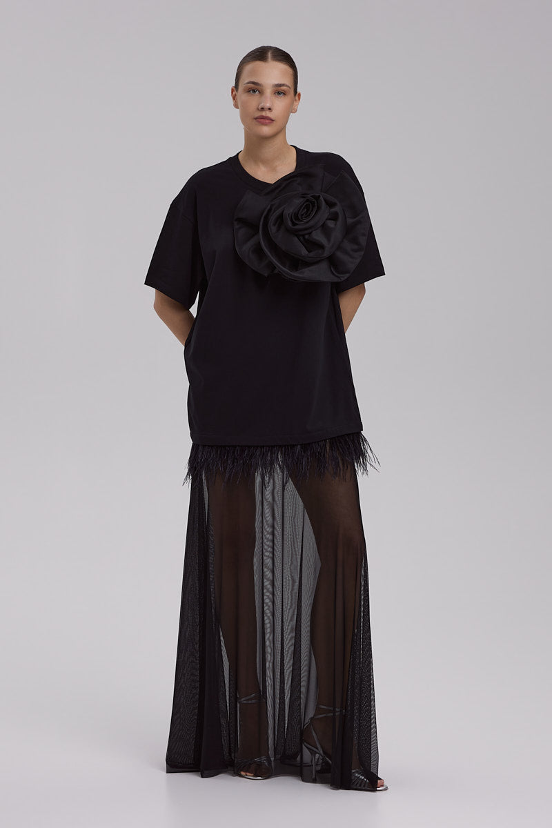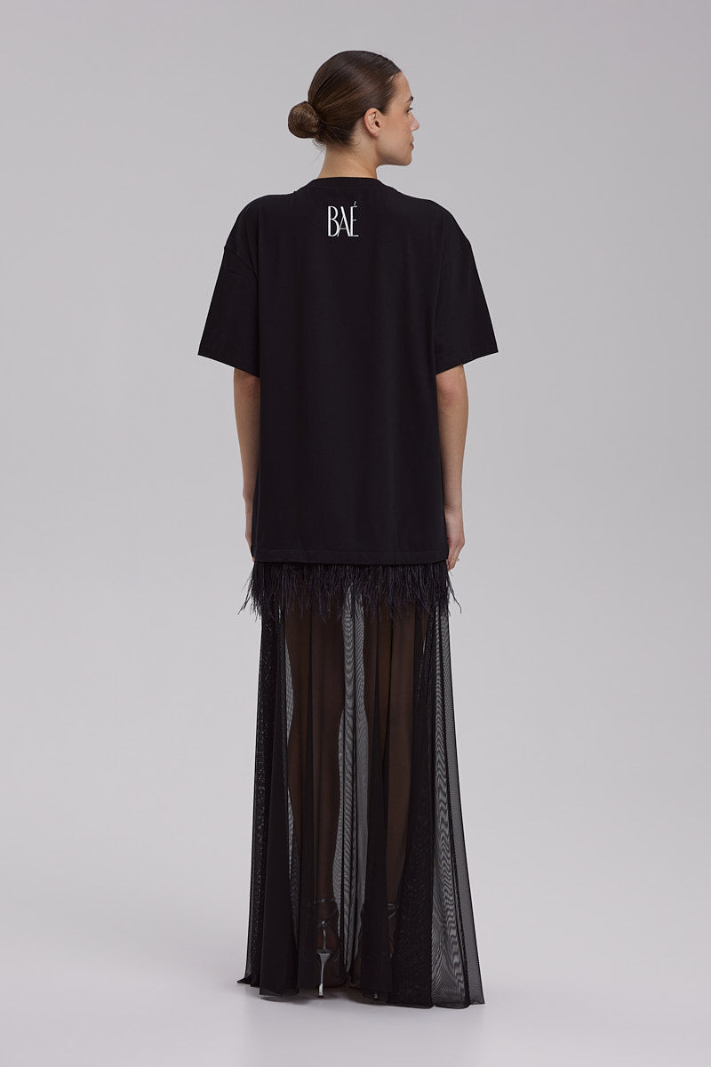 T-SHIRT DRESS WITH FEATHERS + CAMELIA BROCH AND TULLE SKIRT | in black