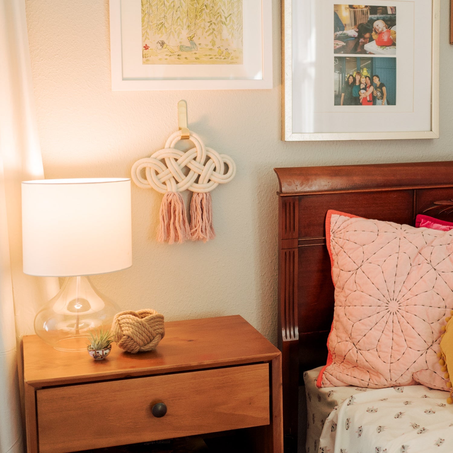 The fair trade Infinity Knot Wall Hanging features a beautifully unique knot handmade from cream colored cotton rope. It is a stunning addition to any hallway, dining room, or gallery wall display. The colorful cotton tassels add a bit of fun to this elegant handcrafted piece. The size is perfect for a small space like a powder room, reading nook, or nursery.
